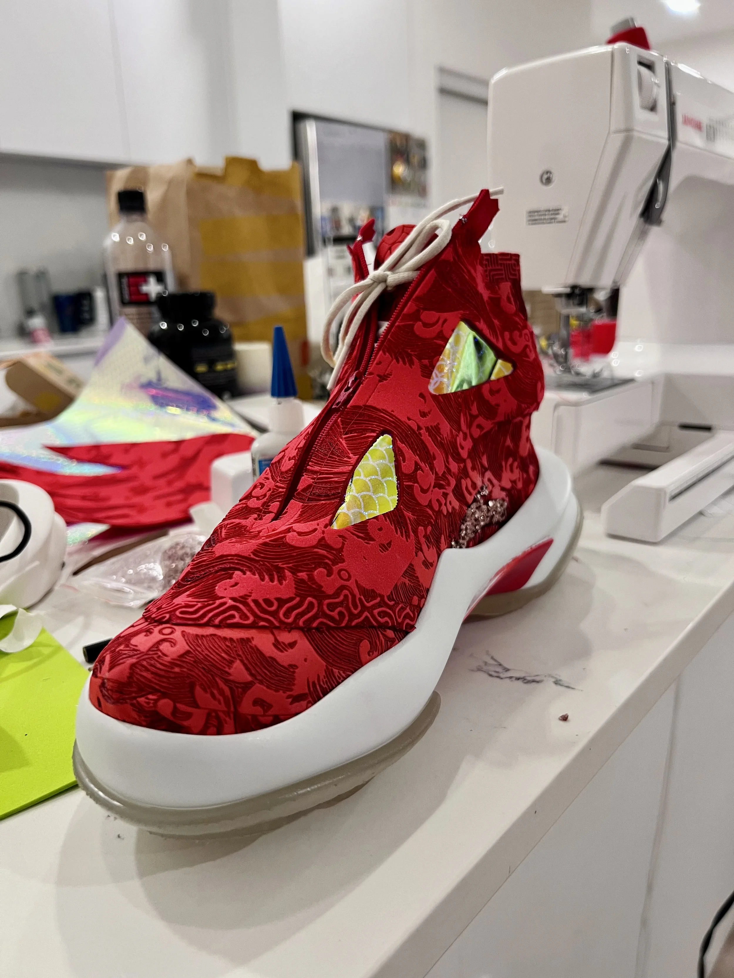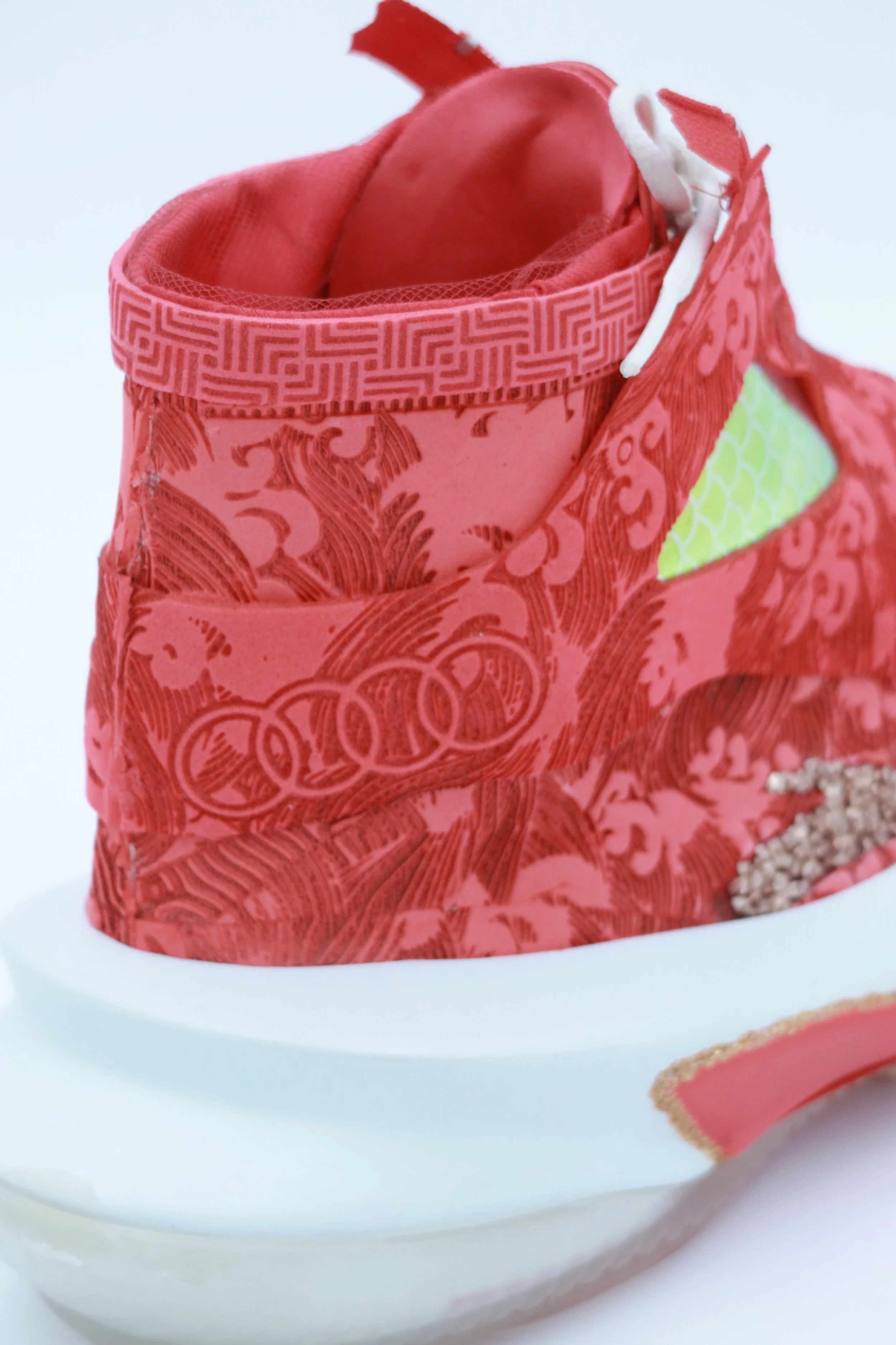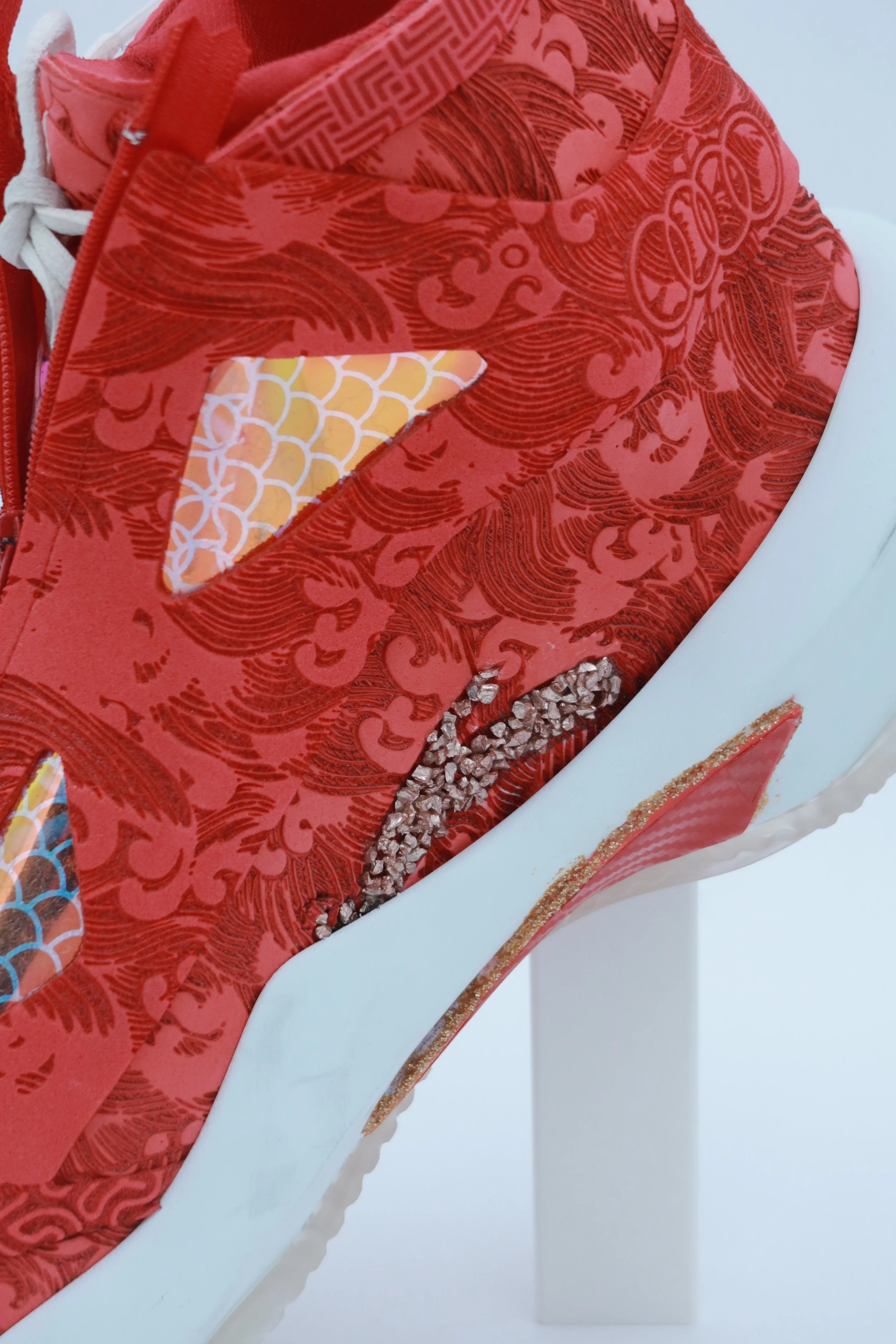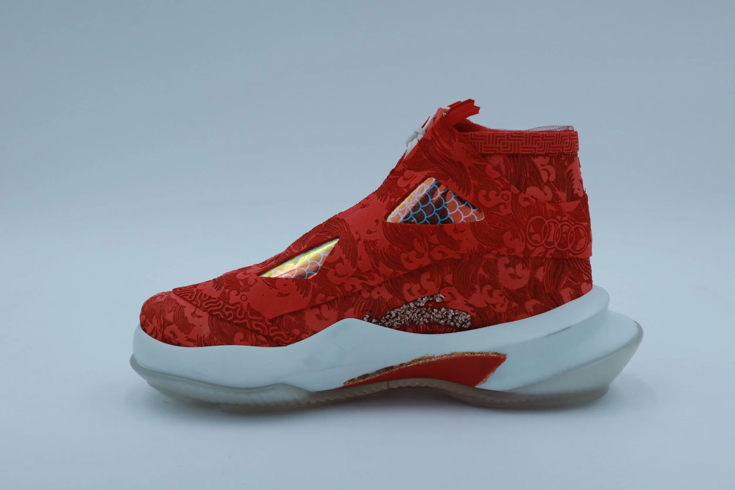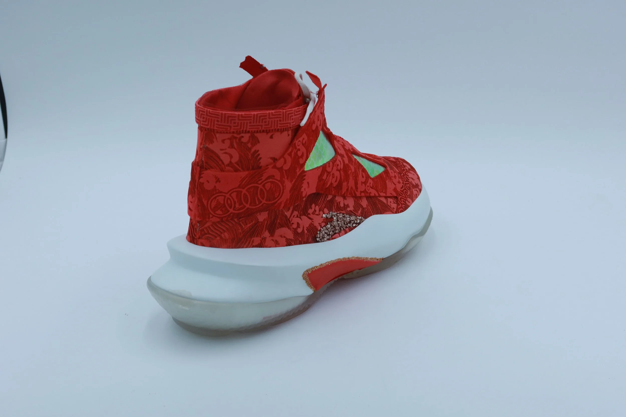 Design a cutting-edge basketball shoe that reflects the collaborative innovation of ANTA and Audi, tailored for Kyrie Irving. The shoe incorporates a shimmer aesthetic, emphasizing style, functionality, and high performance on the court.